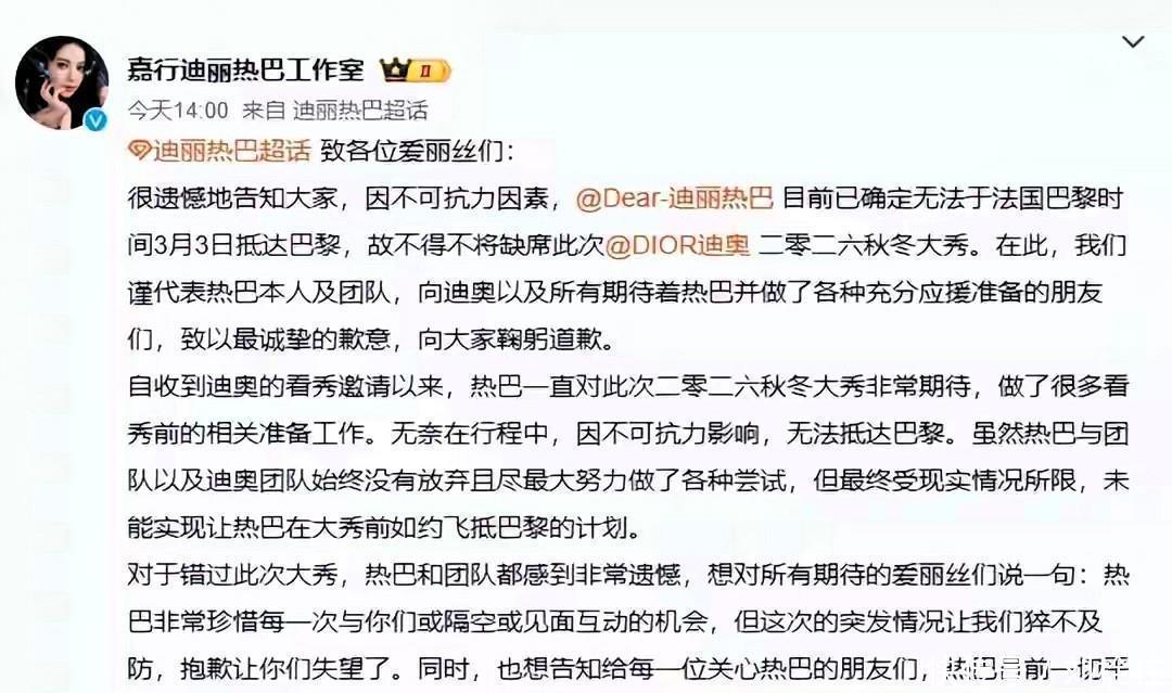 直到巴黎时间3月3日,迪奥的盛大秀如期开始,迪丽热巴也完全没法到场,工作室拖到后来才姗姗来迟地发出声明。