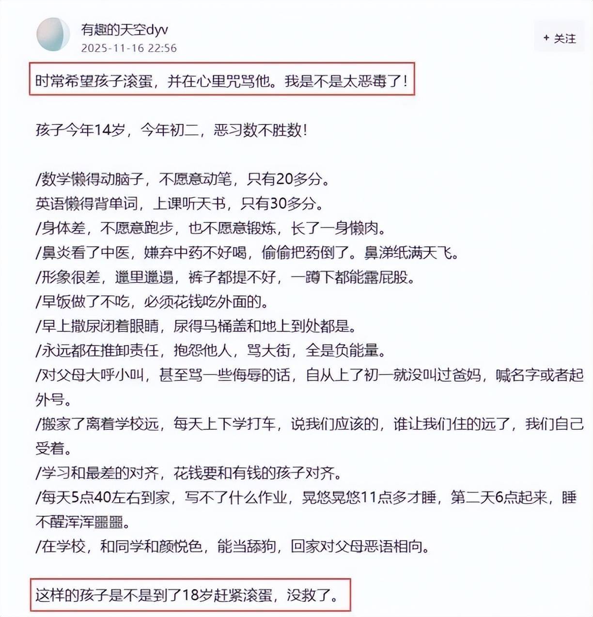 更让人心寒的是他对父母的态度。自从上了初一,就再也没叫过爸妈。对父母大呼小叫是家常便饭,甚至会直接辱骂。