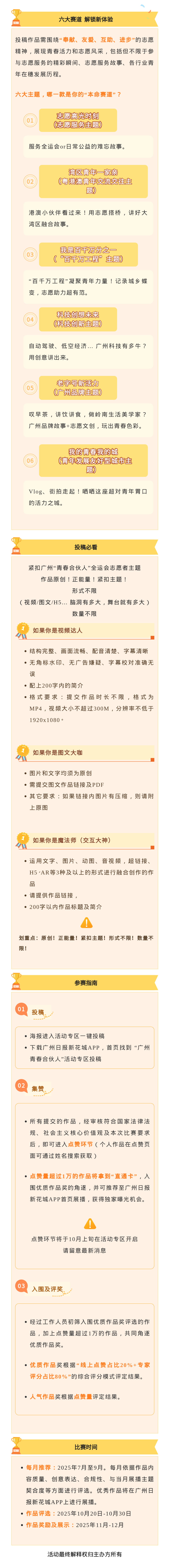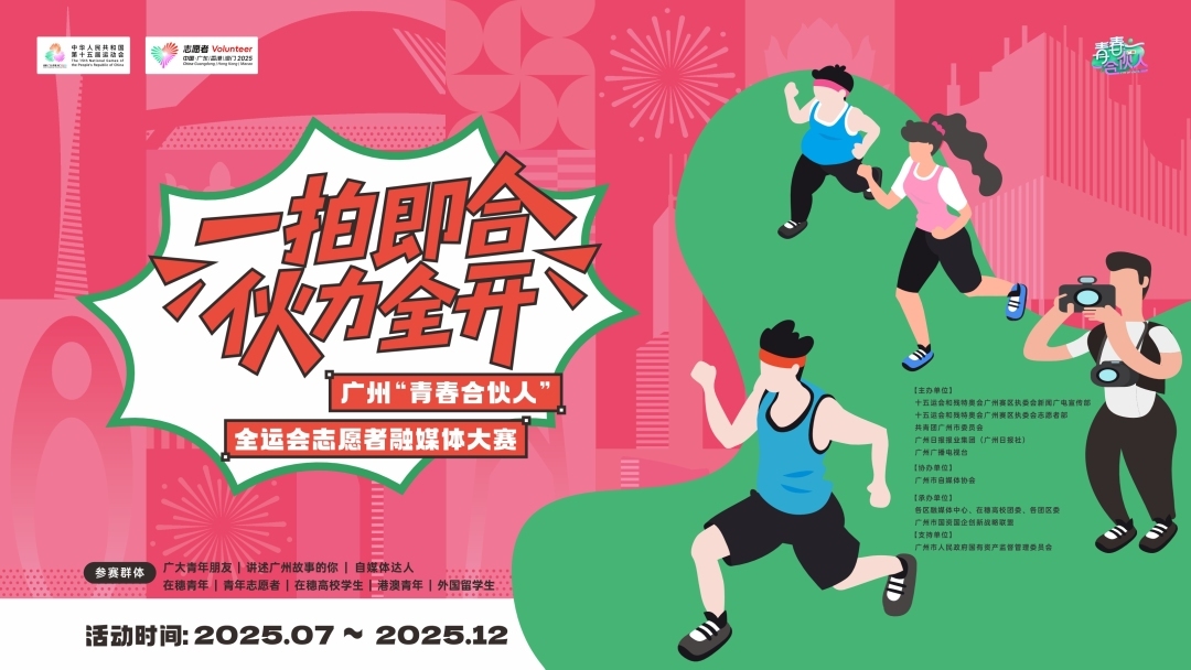 广州“青春合伙人”全运会志愿者融媒体大赛,自启动以来收到共计近200份作品,网友们踊跃投稿,参与热度值拉满。据了解,本次大赛征集截止时间为10月20日。广大青年朋友们想要在十五运会和残特奥会即将来临之际,让你的才华发光、志愿出圈,解锁万元创作基金+十五运门票,同时有机会获得“志愿时”,秀出你的“广州青春”。